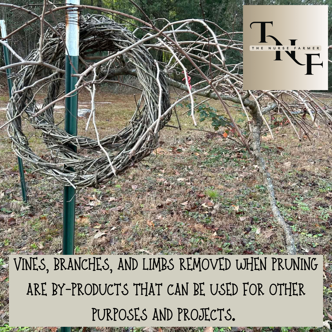 Pruning and trimming are not necessarily labor intense activities. However, pruning and trimming are generally done in the winter months while trees and vines are dormant. Pruning helps stimulate new growth in the spring. I think of the vines, branches, and limbs that I remove as by-products that can be used for other projects and purposes. For example, when I cut my muscadine grapevines, I almost immediately weave them into wreaths while the vines are still pliable. The wreaths will harden off and become ridged so they can be decorated later in the year. I cut the larger muscadine wood into smaller pieces to use for smoking meats in my smoker. Small tree branches and limbs can be used as kindling to start fires, whereas larger limbs can be cut into logs for indoor or outdoor fireplaces. Long, straight, slender limbs can be used to make roosts for chickens. They can also be used to make tripods and other types of trellises for a spring garden.