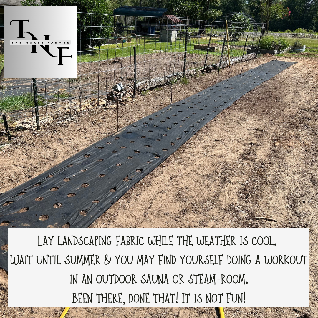 Laying landscaping fabric can be somewhat labor intensive, especially if the fabric is being applied to a large size bed. If you are an older adult like me, the workload can be even more intense. I find myself constantly getting up and down, rolling fabric across the soil, hammering landscaping pins in place, pushing the wheelbarrow from one end of the garden to another… You get the picture? Laying landscaping fabric can be quite a workout. If you are going to apply landscaping fabric to your garden bed, do it now while the weather is cool. Otherwise, you may find yourself doing an aerobic workout in an outdoor sauna or steam-room. Been there, done that! It is not fun!
